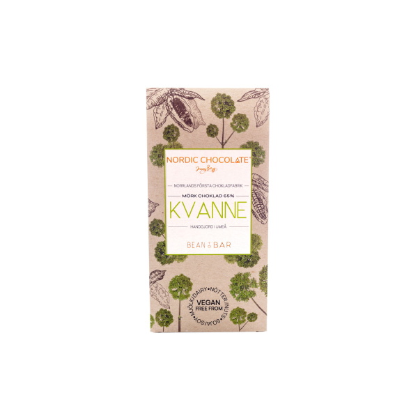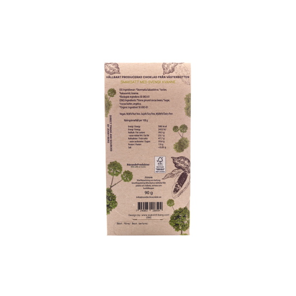 Jenny Bergin suklaatehtaalla Uumajassa jokainen suklaalevy valmistetaan suurella kunnioituksella raaka-aineita kohtaan. Tämä suklaa on täysin vegaaninen, maidoton, pähkinätön ja soijaton. Koska tehtaalla ei käsitellä lainkaan gluteenia, se on turvallinen valinta myös keliaakikoille. Kivimyllyssä jauhetut luomukaakaopavut Nicaraguasta ja Ecuadorista luovat täyteläisen pohjan, joka antaa väinönputken yrttiselle raikkaudelle tilaa loistaa. Säilytä suklaa viileässä (16–18 °C), mutta tarjoile se aina huoneenlämpöisenä. Näin tunturien aromit ja kaakaon monivivahteiset nuotit avautuvat täydellisesti.