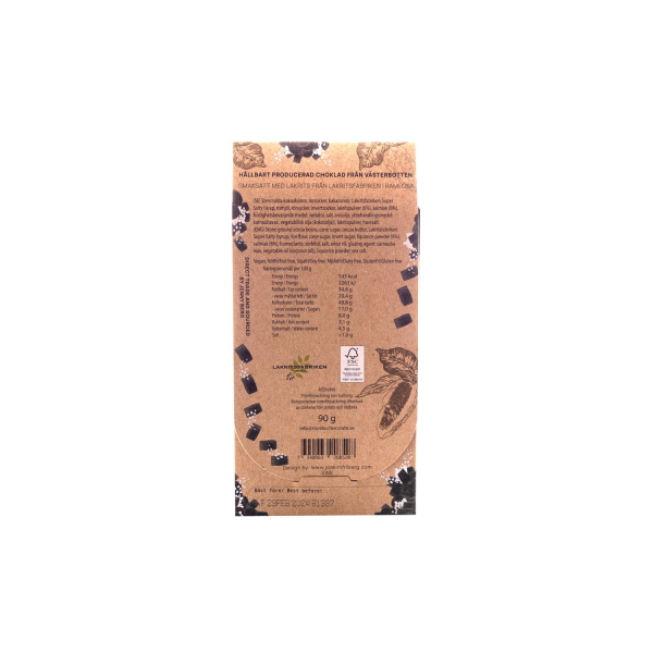 Kivimyllyllä jauhetut kaakaopavut, sokeri, kaakaovoi, Lakritsfabriken Super Salty (siirappi, riisijauho, sokeri, inverttisokeri, lakritsijauhe (6 %), salmiakki (6 %), kosteudensäilyttäjä: sorbitoli, suola, aniisiöljy. Pintakäsittelyaine: karnaubavaha, kasviöljy (kookosöljy)), Lakritsijauhe, merisuola, Paino: 90 grammaa, Säilytä viileässä, 16-18 asteessa, Nauti huoneenlämpöisenä