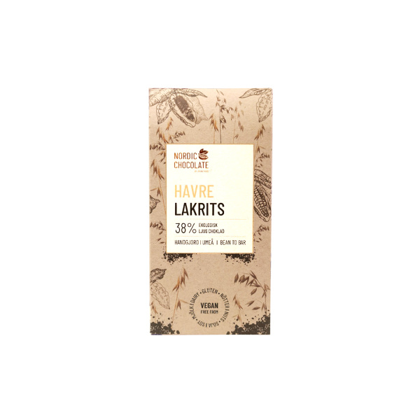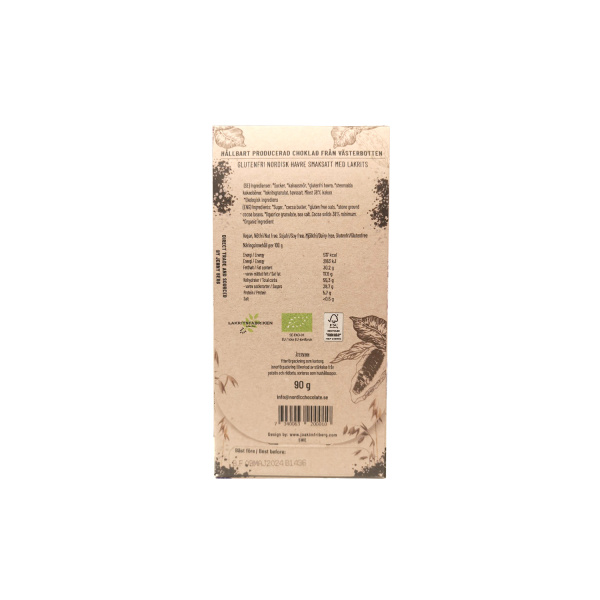 Sokeri, kaakaovoi, gluteeniton kaura, kivimyllyllä jauhetut kaakaopavut, lakritsirae, merisuola, Vähintään 38 % kaakaota, Luonnonmukainen ainesosa, Paino: 90 grammaa, Säilytä viileässä, 16–18 asteessa, Nauti huoneenlämpöisenä